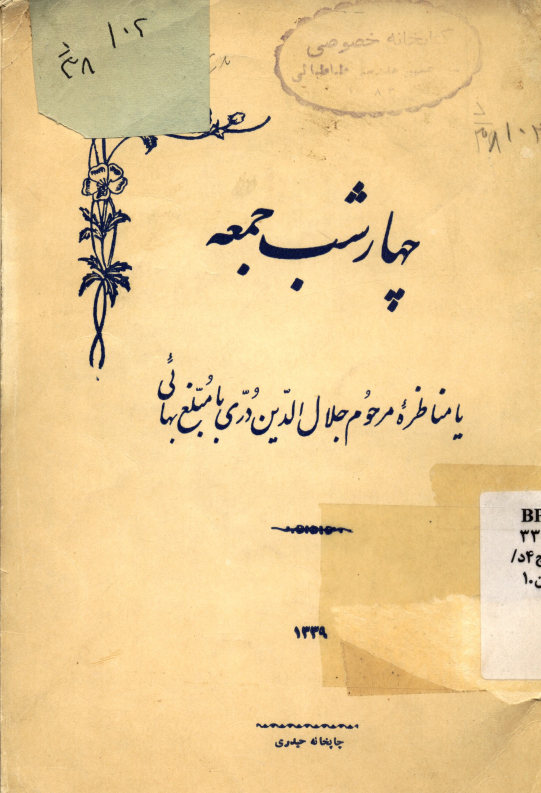 عنوان روي جلد: چهار شب جمعه، يا، مناظره مرحوم جلال الدين دري با مبلغ بهائي