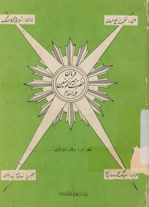 دستور حکومت: فرمان حضرت علی امیرالمومنین علیه السلام بمالک اشتر بچهار زبان: عربی منتخب از نهج البلاغه، فارسی اثر محمد حسین فروغی، فرانسه بقلم صادقیان، انگلیسی بقلم سید باقری