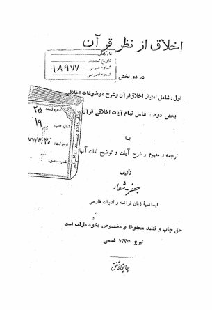 < بخش اول : شامل امتياز اخلاق قرآن و شرح موضوعات اخلاقي.- بخش دوم : شامل تمام آيات اخلاقي قرآن : با ترجمه و مفهوم و شرح آيات و توضيح لغات آنها >